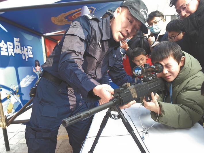 装备展示区内,在民警的指导下,小朋友体验警用枪械。