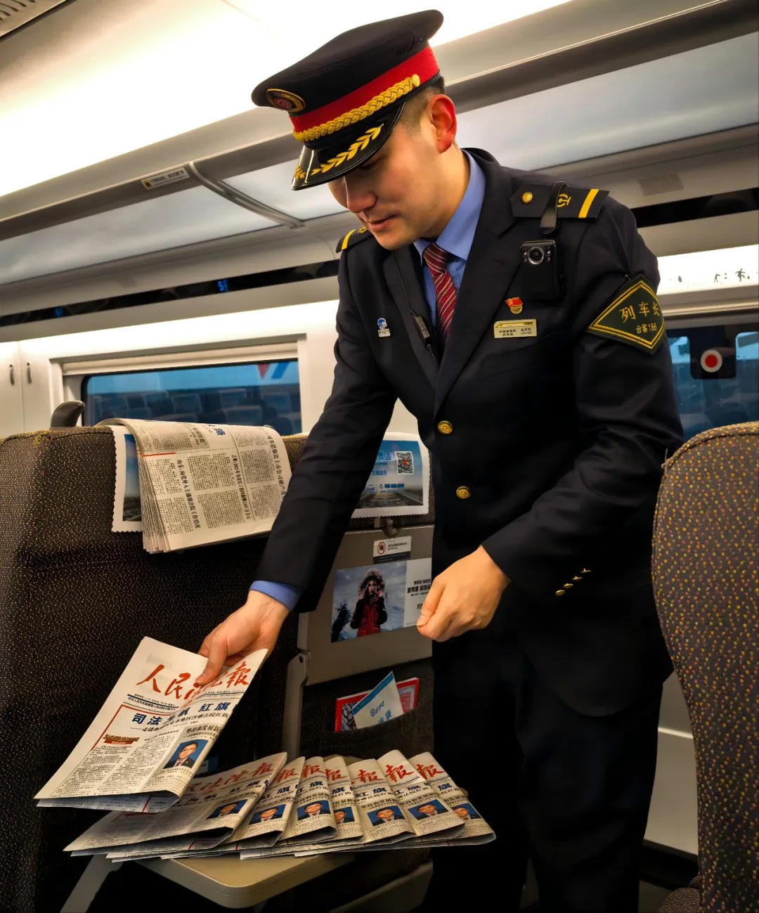 2026年1月4日,从合肥南站开往北京南站的G42次列车长王子亮多了一项额外的工作,在等候旅客上车的时间里,他和乘务员一起,快速将《人民法院报》放入座椅后的报刊袋里,供旅客阅读。