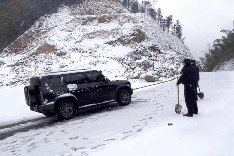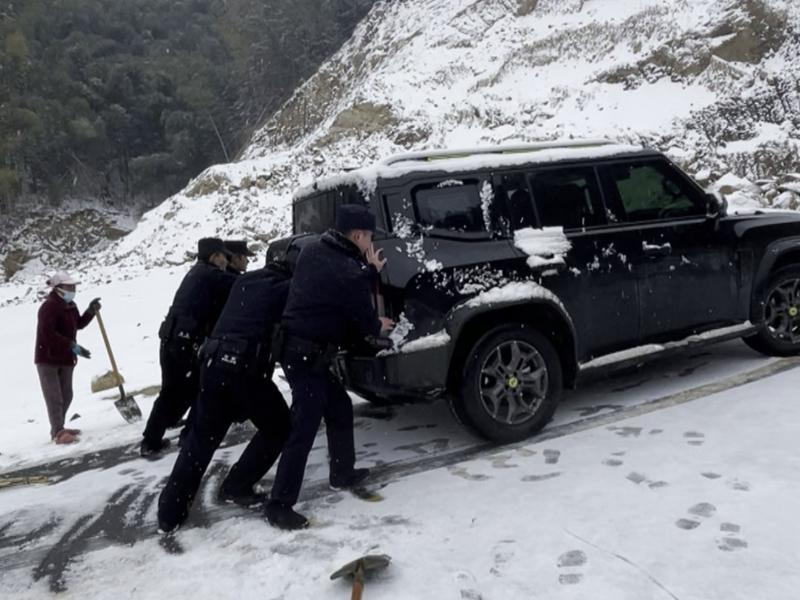 柳坪派出所民警巡逻期间发现被困车辆后,立即展开救援。他们用随车携带的铁锹和扫帚,分段清理出50余米的安全通道,专人指挥车辆缓行。