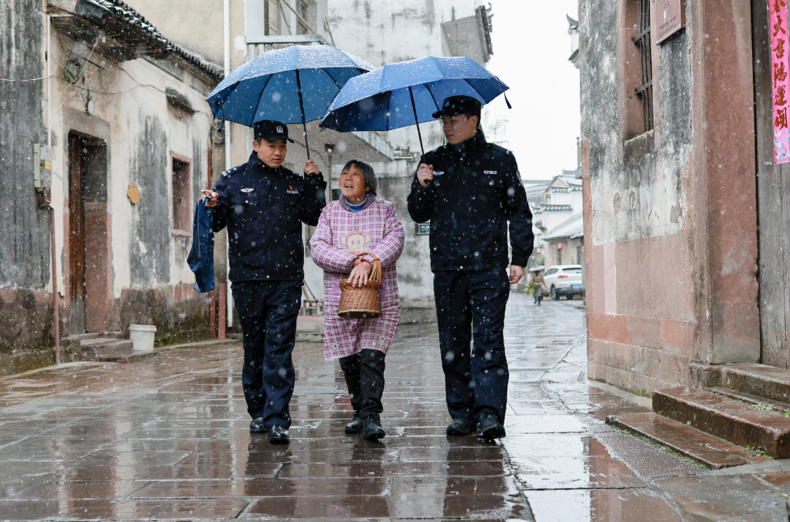 1月20日,黄山市休宁县公安局组织警力,冒雪深入辖区村落开展走访排查,与留守老人拉家常、问冷暖。吴沛 摄