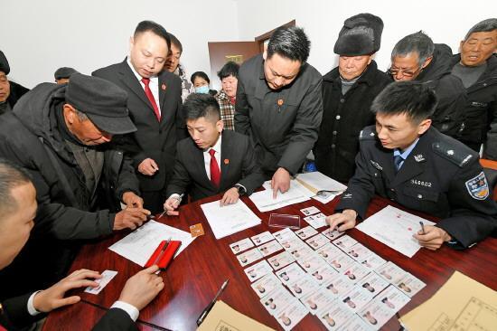 近日,安徽省宿州市埇桥区人民法院加大涉民生案件审、执力度,设立“执行110”举报热线,开通服务“绿色通道”,让农民工能“安薪”回家过年。图为法院工作人员为农民工办理欠薪发放手续。 本报记者 李光明 本报通讯员 阮传宝 摄