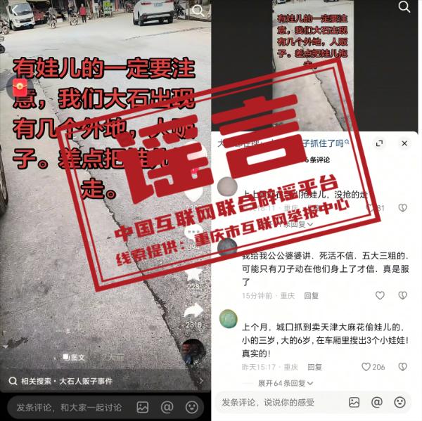 真相:近日,有网民在互联网平台发布信息称“重庆合川大石出现人贩子,差点把娃儿抱走”“城口抓到偷娃儿的,车厢里搜出3个娃娃”,引发关注。经核实,网传信息系谣言。据当地公安机关核实,合川、城口近期未接报“人贩子出没”“偷娃儿”等相关警情,目前警方正依法对造谣人员开展调查。