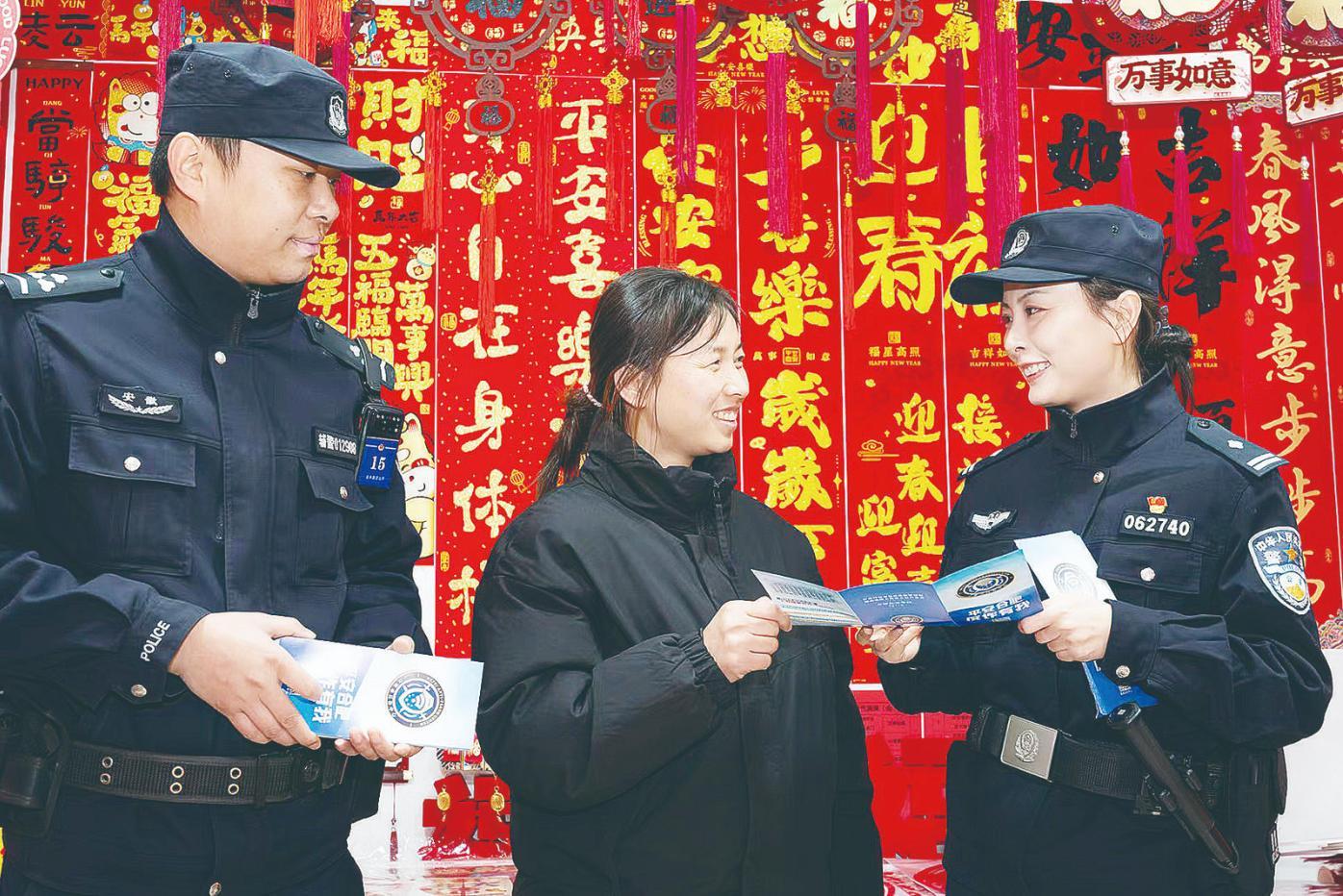 春节即将来临,合肥城隍庙的年味渐浓。合肥市公安局安庆路派出所民警提前进驻市场,开展高频次步巡,并深入摊位发放反诈宣传单,讲解安全防范知识。(通讯员 汪佳影胡永钜 记者 李斐 摄)