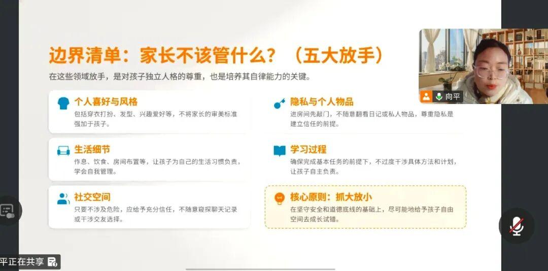 “孩子的违法犯罪行为与家庭教育缺位、教育方式不当密切相关,作为监护人,大家要深刻反省家庭教育中的问题。这是我们为大家开展的第二次家庭教育指导课,希望各位认真学习、学以致用。”课程中,检察干警联合家庭教育指导师,通过远程视频连线的方式,为涉案未成年人家长开展专题指导。指导课围绕教育理念为何转型、家长角色如何重塑、如何搭建亲子沟通桥梁、怎样成为孩子成长的坚实后盾四个核心方面展开,引导家长摒弃对孩子的“单向管控”思维,建立起平等尊重的“双向合作”亲子关系。授课结束后,参与的家长表示,此次指导收获颇丰,今后会多花时间陪伴孩子,运用科学的方法教育引导孩子,努力为孩子营造健康、良好的家庭成长环境。