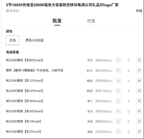 在某网络批发采购平台用关键词“充电宝”进行搜索,大量只要十几元的充电宝产品映入眼帘。平台要求强制认证的3C编号,有供应商只是随便填一个了事。甚至有的产品介绍中明确写着“外标20000毫安时的充电宝,实际可以是2400毫安时、3600毫安时电芯”。