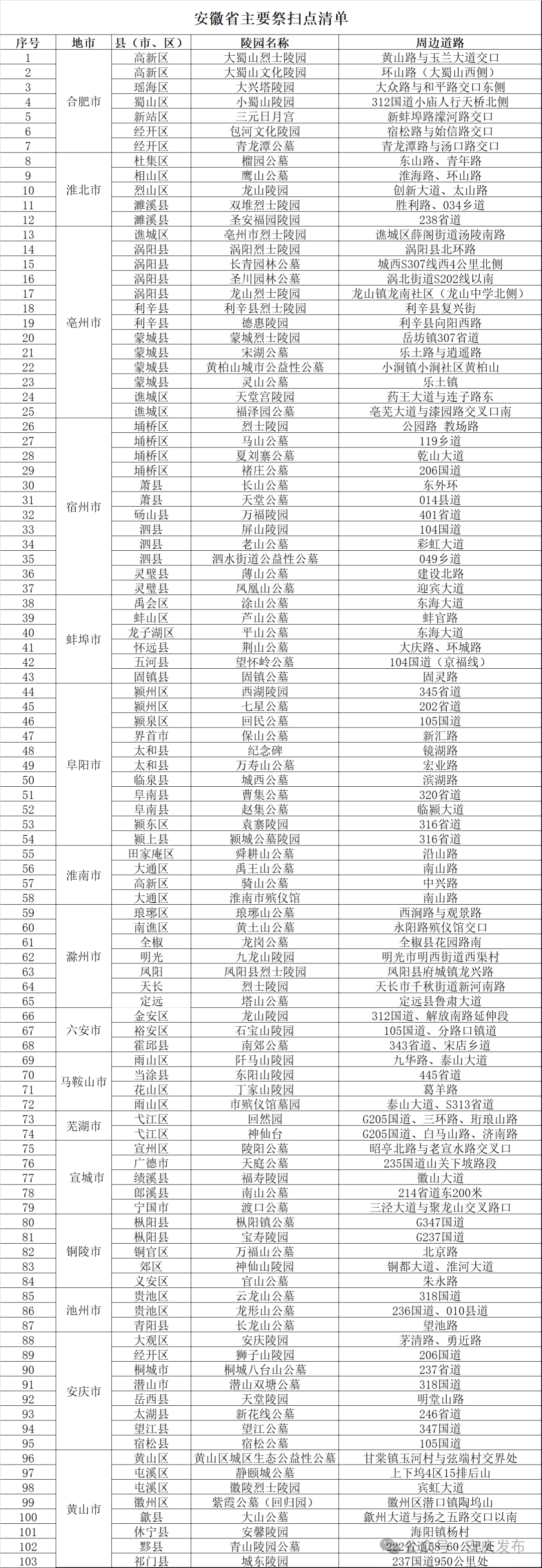 清明节临近,群众祭扫、踏青出游等活动叠加,全省墓区、景区周边车流、人流或将大幅攀升。安徽公安交管部门结合实际出行情况,梳理了省内主要祭扫点及交通出行指南,呼吁广大群众错峰出行、文明祭扫,安全有序缅怀先人。