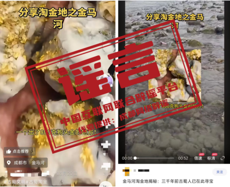 详情:近期,不少自媒体在网络平台分享“都江堰金马河是淘金地”,称该点位是“一个出了800克狗头金的地方!”对此,4月4日,都江堰市水务局发布情况通报称,经联合调查组核实,相关视频系李某某为博取关注,吸引流量,促进店铺旅游产品销售,从AI平台搜索“淘金”“狗头金”等内容,拼接剪辑在抖音平台发布,视频内容严重误导公众。经法治宣传教育,视频发布者已主动删除相关视频。(来源:“成都网络辟谣”微信公众号)