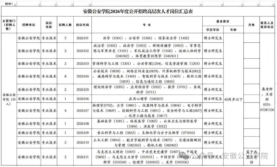 招聘计划:30人,招聘岗位详见《安徽公安学院2026年度公开招聘高层次人才岗位汇总表》(附件1)。